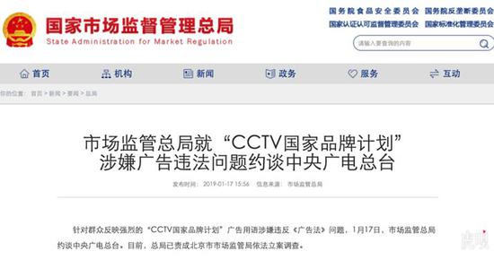 2019年1月17日,國(guó)家市場(chǎng)監(jiān)督管理總局針對(duì)“CCTV國(guó)家品牌計(jì)劃”廣告用語(yǔ)涉嫌違反《廣告法》問(wèn)題約談中央廣電總臺(tái),并責(zé)成北京市市場(chǎng)監(jiān)管局依法立案調(diào)查。