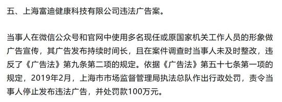 2019年,上海富迪健康科技有限公司因使用多名國(guó)家機(jī)關(guān)工作人員的形象做廣告宣傳,被罰款100萬(wàn)元。
