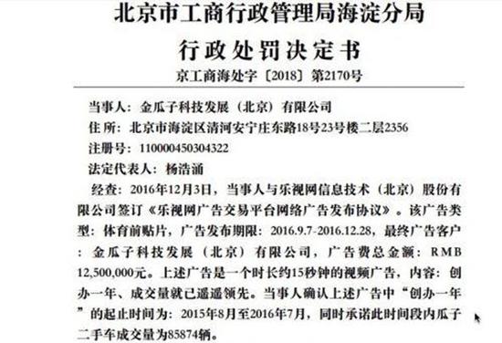 2018年11月15日,金瓜子科技發(fā)展(北京)有限公司因在廣告中使用瓜子二手車(chē)“創(chuàng)辦一年、成交量就已遙遙領(lǐng)先”的不實(shí)宣傳語(yǔ),被罰款1250萬(wàn)元。