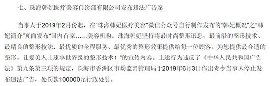 2019年,珠海韓妃醫(yī)療美容門(mén)診部有限公司發(fā)布包含“國(guó)內(nèi)首家”、“最前沿的整形技術(shù)、最精良的整形技法、最優(yōu)秀的整形效果”、“世界級(jí)的整形技術(shù)”的宣傳內(nèi)容,被罰款10萬(wàn)元。