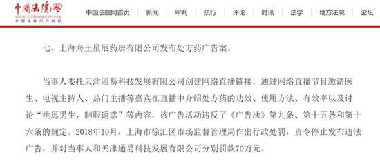 2018年6月15日,上海海王星辰藥房有限公司因開(kāi)展“有球必硬夜夜激情”網(wǎng)絡(luò)直播活動(dòng),被依法處罰款70萬(wàn)元。