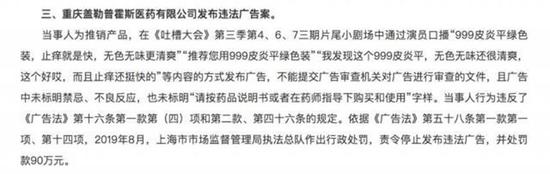 2019年12月17日,999皮炎平因在《吐槽大會(huì)》第三季第4、6、7三期片尾小劇場(chǎng)中通過(guò)演員口播廣告,但未標(biāo)明禁忌、不良反應(yīng),也未標(biāo)明“請(qǐng)按藥品說(shuō)明書(shū)或者在藥師指導(dǎo)下購(gòu)買(mǎi)和使用”字樣,被罰款90萬(wàn)元。