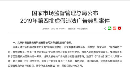 北京尚德在線教育科技有限公司在廣告中宣稱(chēng)“一年學(xué)完,國(guó)家承認(rèn)”,實(shí)際無(wú)法頒發(fā)學(xué)歷證書(shū),被罰款27.93萬(wàn)元。