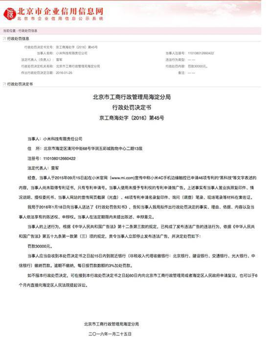 2016年1月25日,小米公司在官網(wǎng)出現(xiàn)“小米4C手機(jī)邊緣觸控已申請(qǐng)46項(xiàng)專(zhuān)利的”文字宣傳,但其實(shí)專(zhuān)利沒(méi)拿到,被處以3萬(wàn)元罰款。